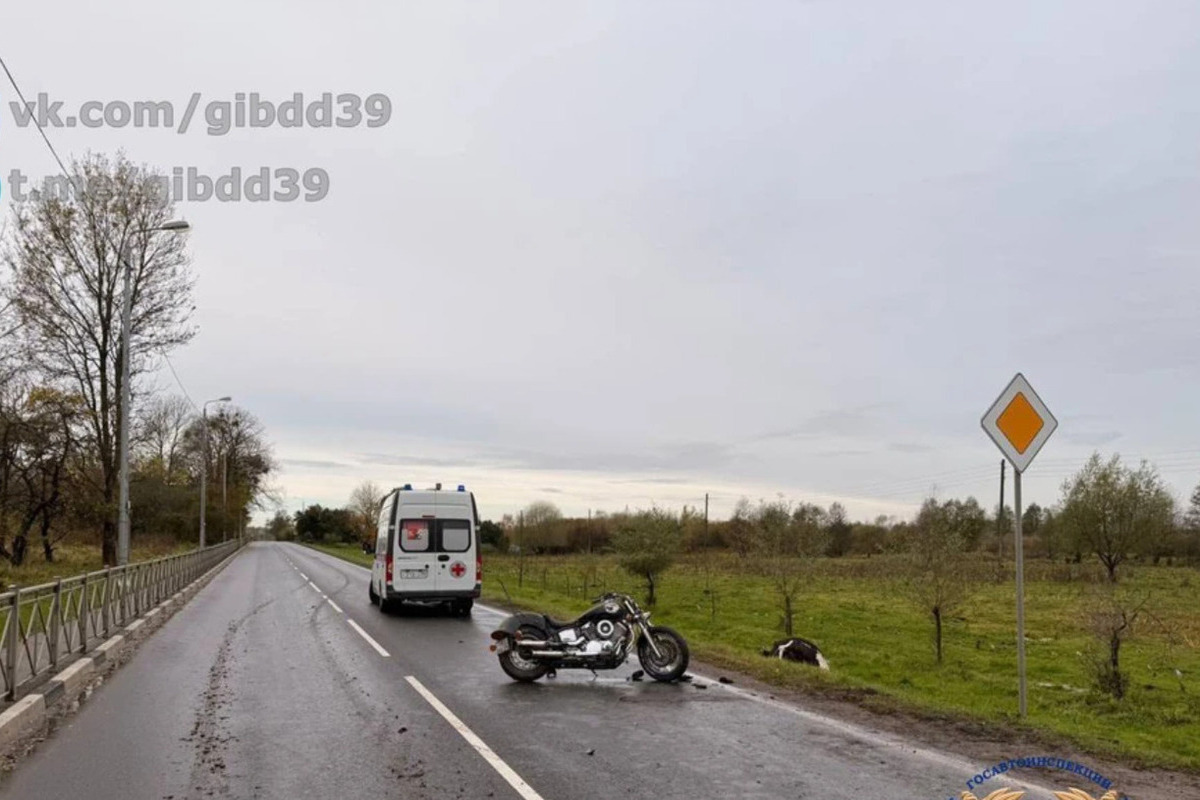 Мотоциклист, ехавший по прямой дороге в посёлке Заовражное Черняховского района, сбил корову. Сам водитель мотоцикла получил травмы.