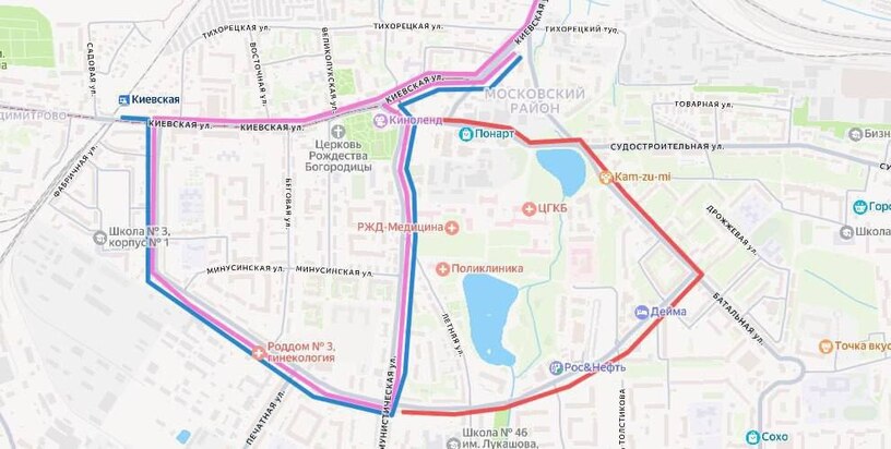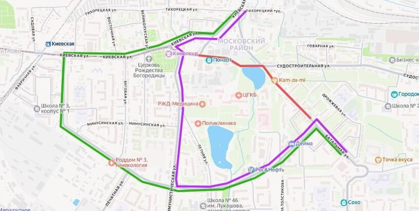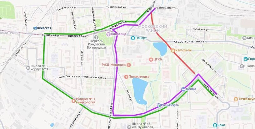 В направлении, следующем с Павлика Морозова, объезжают по маршруту улица Павлика Морозова — Автомобильная — Батальная — Олега Кошевого — Батальная.